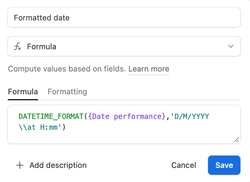DATETIME_FORMAT({Your Date Field},'M/D/YYYY \at h:mma')