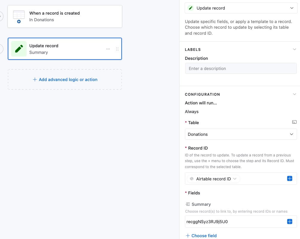 - Under Record ID I copied the record id from the table from formula in table. The Summary table is only record so I just put in a formula in that row.