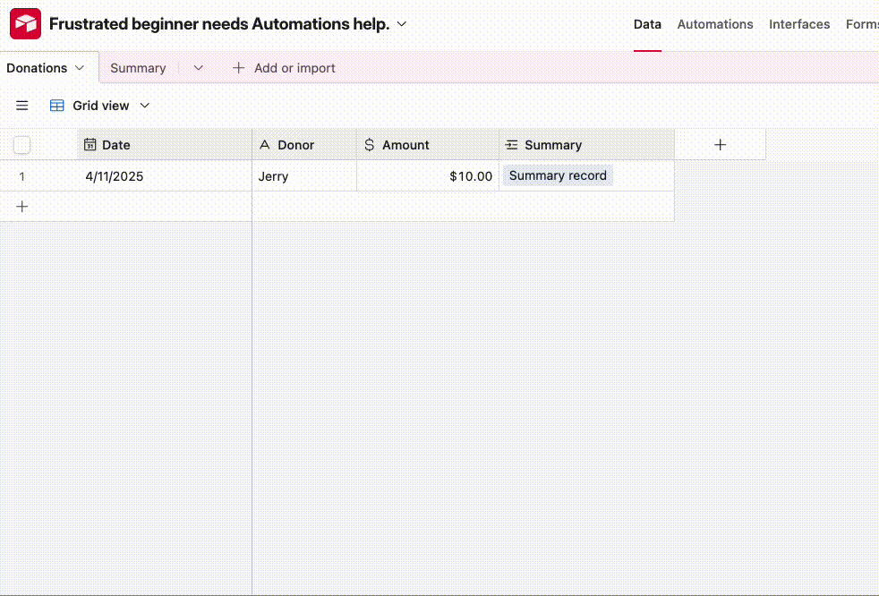 - I want to automate the insertion of a new Donor name into the linked field in the summary table when I create a new record in the Donations table.