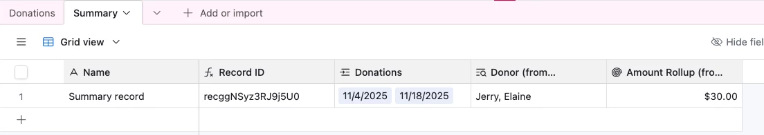 - I have a Donations table with the field Donor that contains a Single Line Text field with the donor name in it.