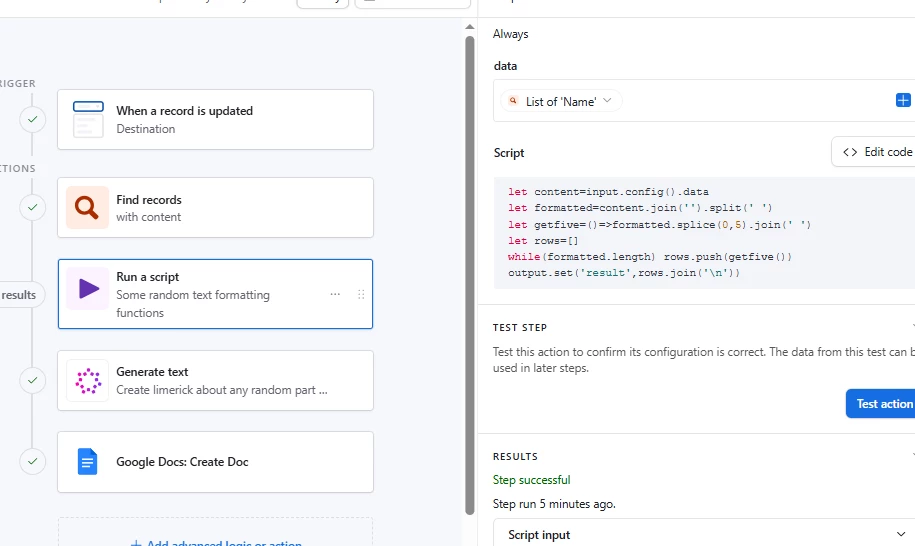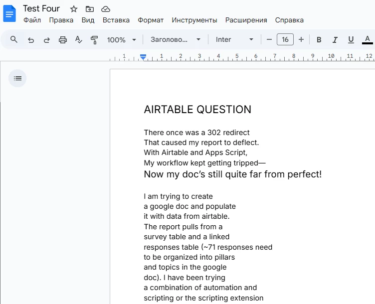 I am trying to create a google doc and populate it with data from airtable. The report pulls from a survey table and a linked responses table (~71 responses need to be organized into pillars and topics in the google doc). I have been trying a combination of automation and scripting or the scripting extension and google app scripts to generate the report. With every attempt so far, I have been blocked by 302 redirect errors. Has anyone been able to successful use the combination of app scripts and air table? I love it for the flexibility on formatting, but am not sure how to proceed.