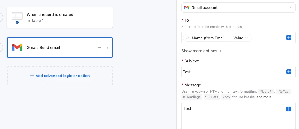 Hm, the setup you mentioned seems to be working fine for me, I was able to send a successful email with the following. Could you provide some screenshots of your data and automation set up? Or if you could DM me a link to an example base that would be much easier too