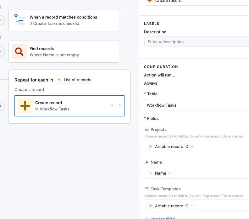 1. When my automation runs, its supposed to populate all 7 tasks into the Workflow Tasks so that the team can start tracking them. However its only pulling up 1 out of the 7 tasks even though my Find Record is showing all 7 Tasks. I have it repeated and for it to create a record but it only does one. How can I fix this?