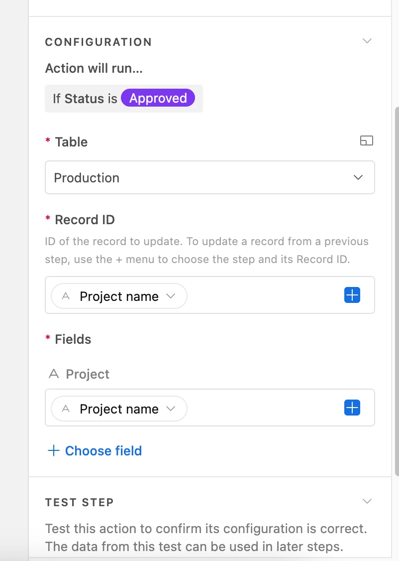 Ah that error's occurring because you're using the "Project Name" value for the "Record ID" input. You need to be using an actual record ID for that, which looks like this: recmh9YZKVGhH0G8m