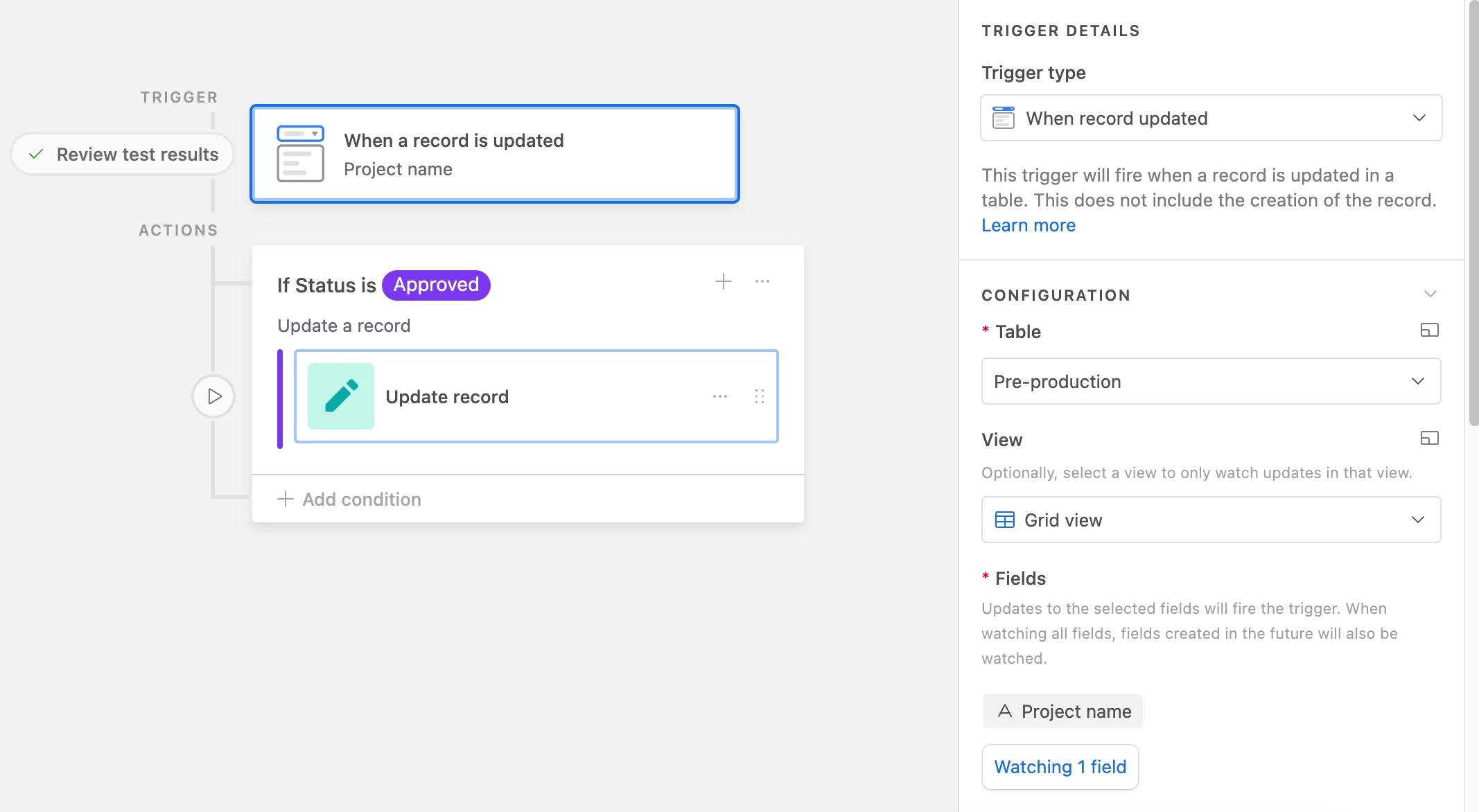 Now I want to make an automation so if the info in Pre-production table is updated, it will also update the same info in the Production table. But I keep getting an error. What am I doing wrong?