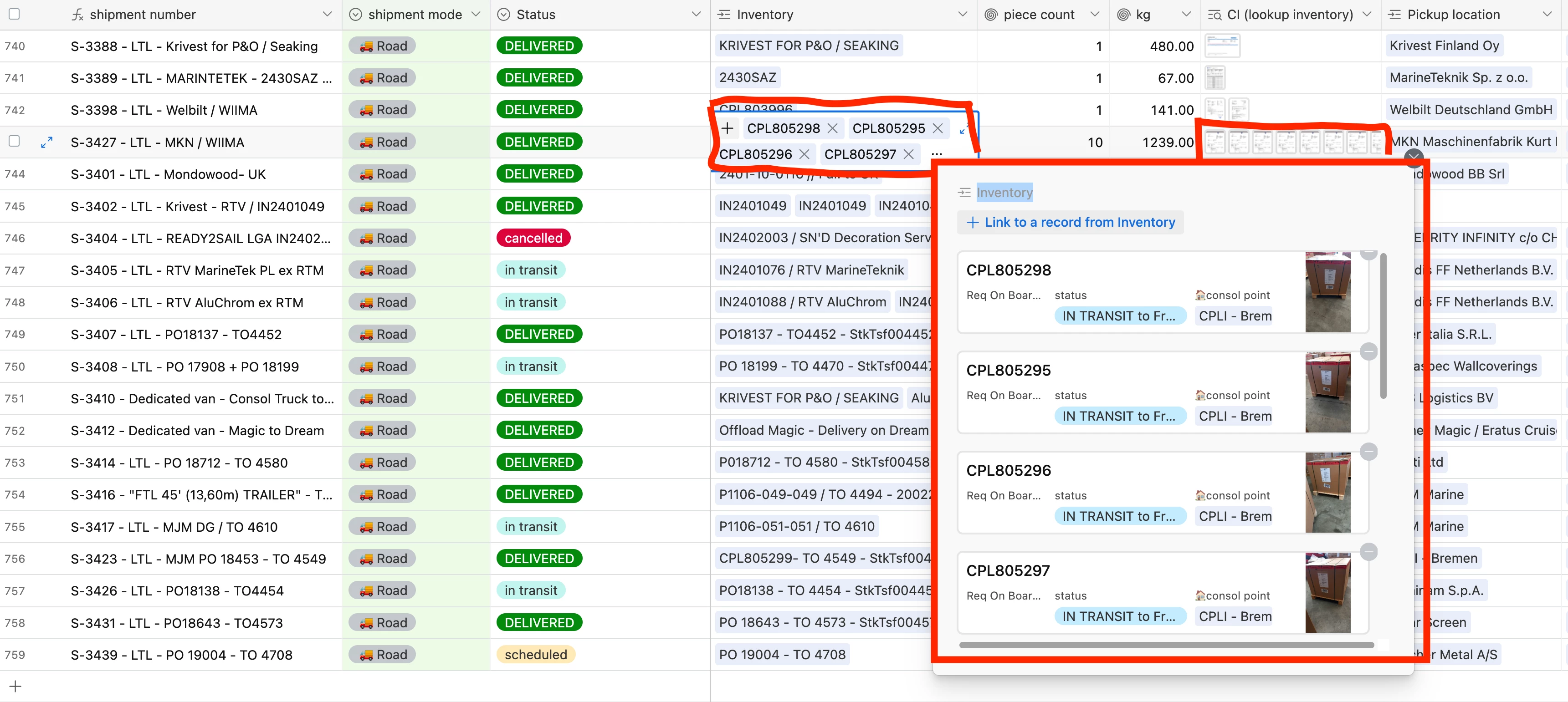 Thank you so much for your message. Maybe I can show you an example to underline my situation. See attached screenshot showing my list of transports (shipments table) with the items included from my inventory table.