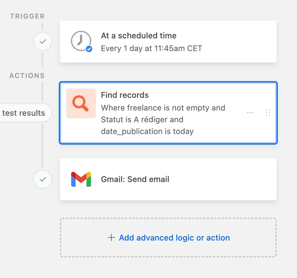 What I understood in human language: "Hey Airtable, you will do something when the Freelance field is not empty, so when there is someone to identify and the status is "A rédiger" and that 'in addition the publication date is for today'.
