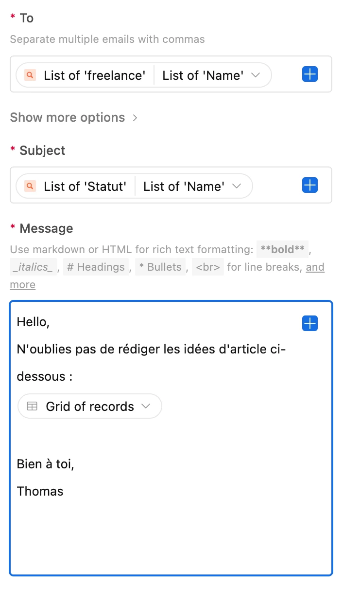 1) How do we automate to send an email to each of the freelancers? So in “To”, there will only be the freelancer concerned?