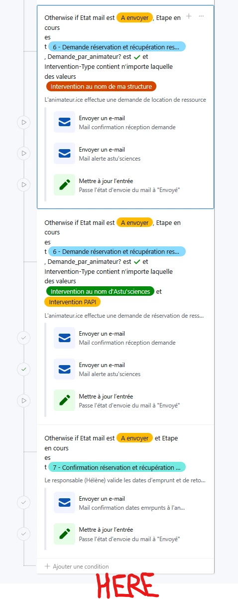 Currently, I want to update the record to mark the email as sent. Right now, I need to include the “Update record” action in every conditional block, because Airtable executes actions only inside the branch that matches.