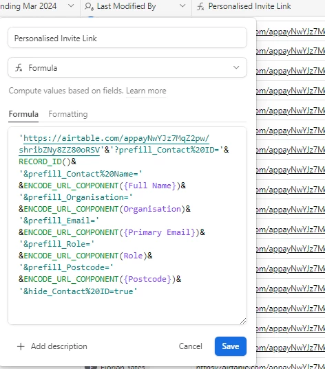 The automation uses a CRM/Contacts table, a RSVP table to collect the new responses, and a form linked to the RSVP table. A personalised link in the CRM/Contacts table is sent to each contact. This link (image attached) is a form prefilled with their name and details, and few empty fields for them to complete. The data entered into the form > feeds into the rsvp table > then updates the CRM/Contacts table records.