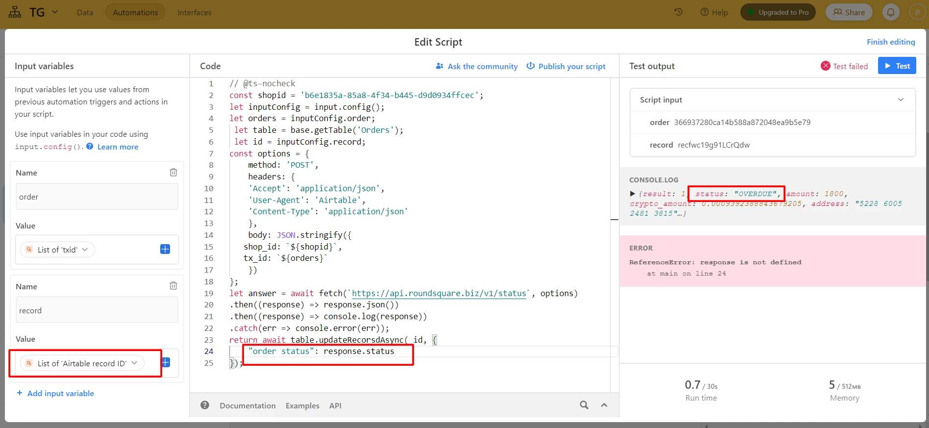 At the moment I can't figure out how to pull the json status from the response where the status of the request is and update the desired row.