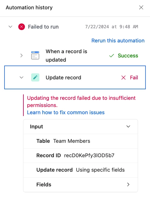 Hi there, I'm having issues with an Automation that I've set up anytime a record is updated between Airtables that are all within the same Workspace and have been granted the same permissions at a Workspace level. I'm getting a message that says the update failed due to insufficient permissions. However, each Airtable belongs to the space workspace and has the same group permissions. Anyone know how I get support on troubleshooting this complex issue?