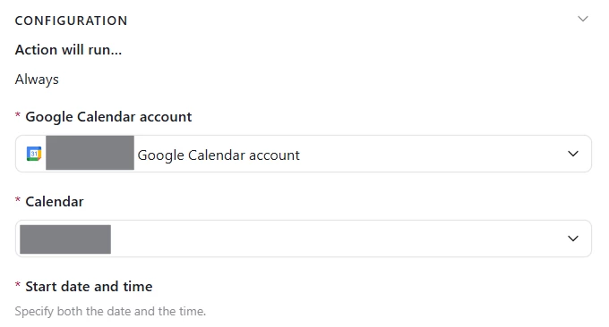 It seems that the Google Calendar: Create Event requires a hard coded (chosen) calendar to place an event in. We have used a shared calendar for this, but it gets somewhat messy.
