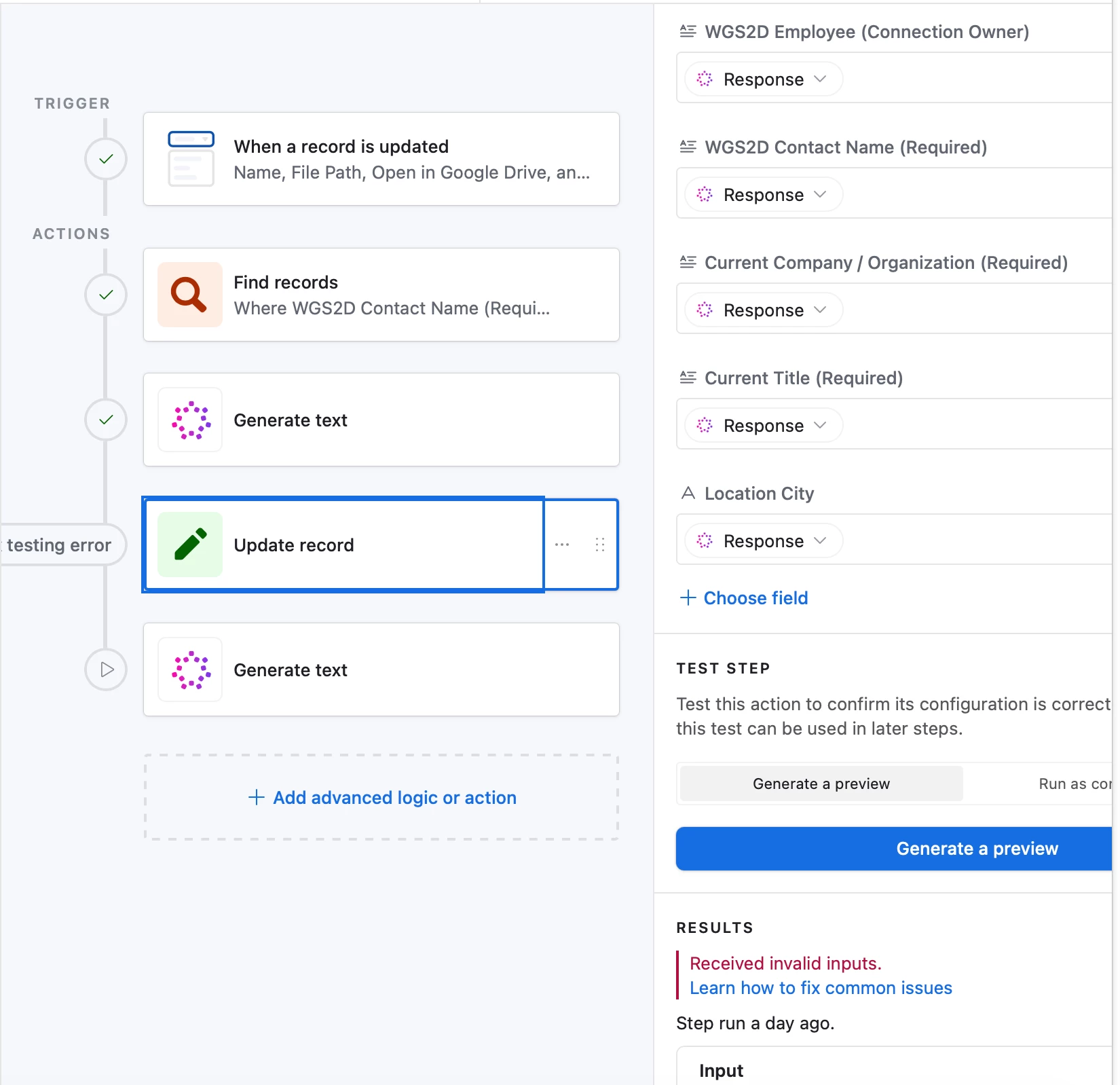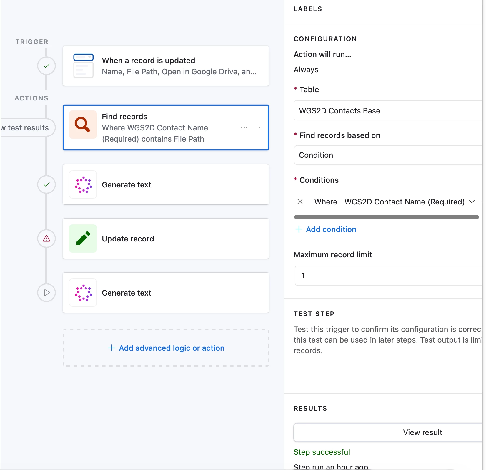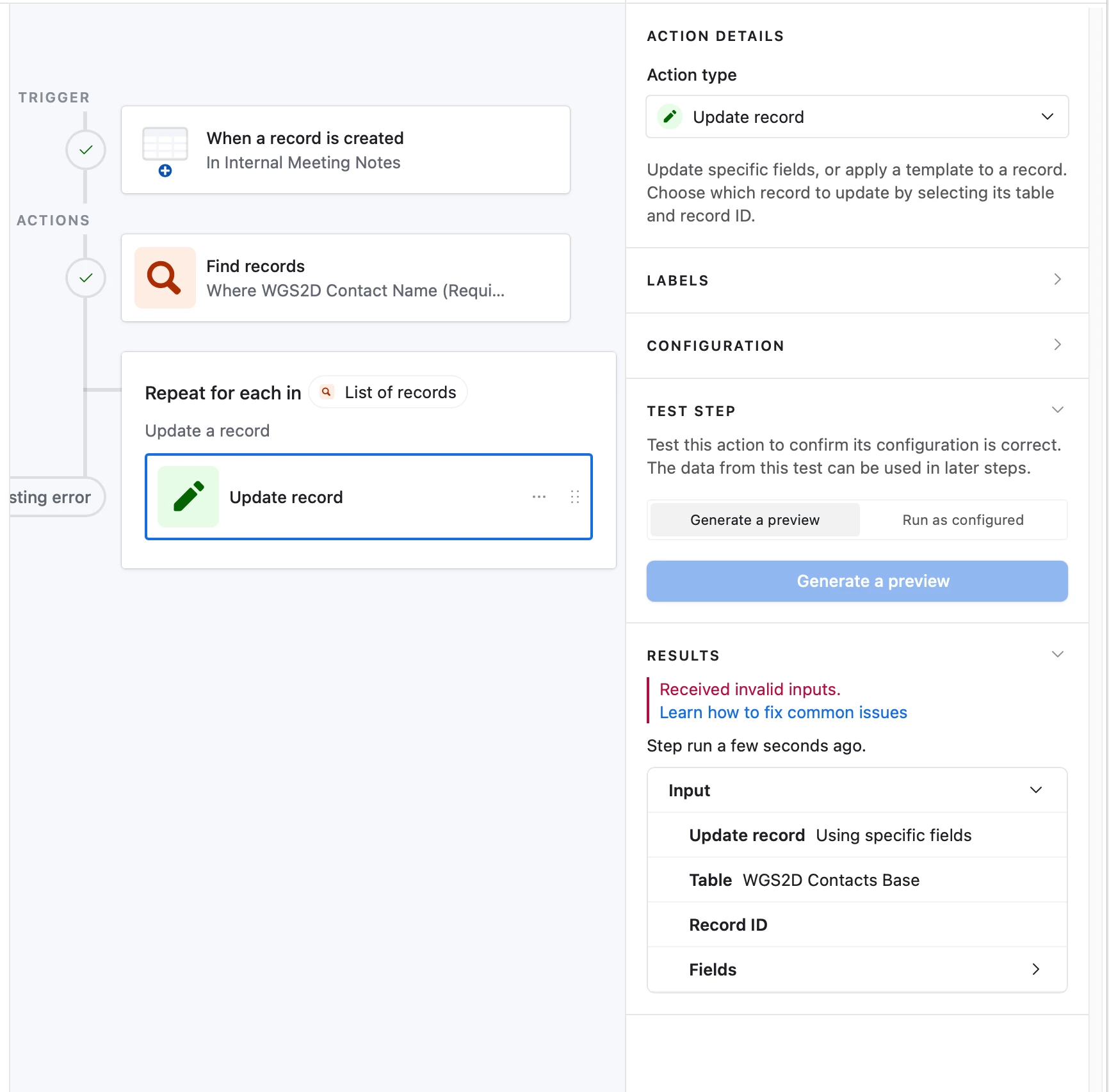 Issue: I created an automation to incorporate a trigger that activates when updates or changes are made to the 'Internal Meeting Notes' table; an action was added to find records, generate AI-driven suggestions for updates, and subsequently update records based on the generated content. Here is a screen shot of the automation. The issues I have are that, I'm getting an error in the “Find record step” as well as the “Update Record” step. See automation screen shots below