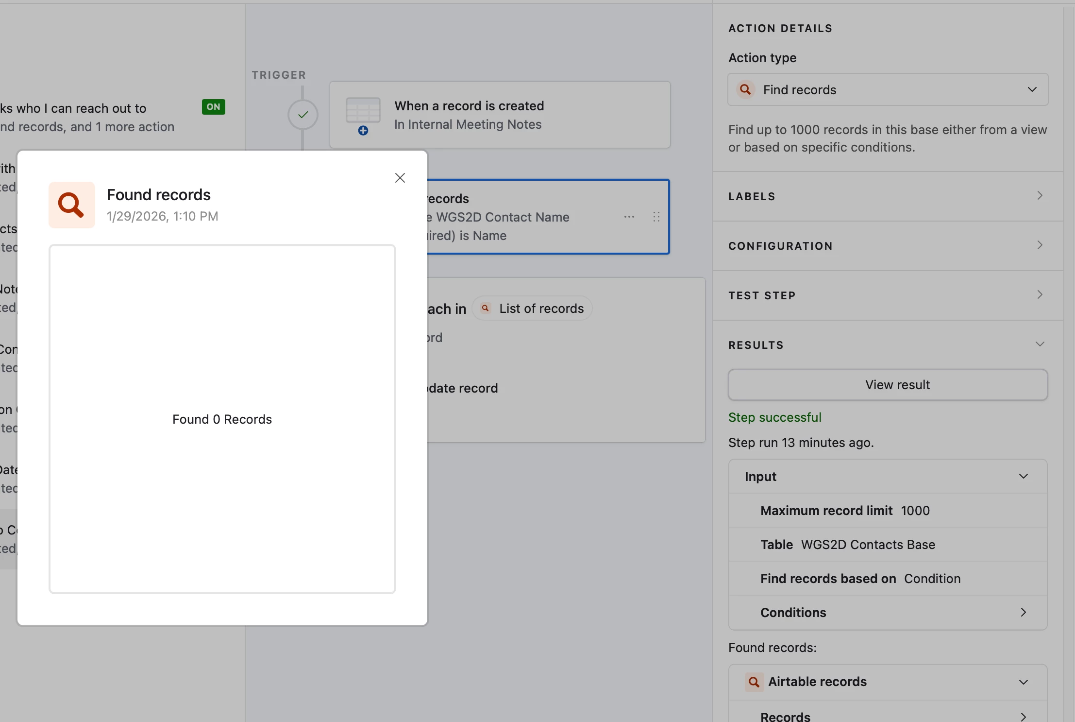 When I run the automation, the Find record returns 0 records. The Updated record fails with “invalid inputs” I assume this is because it returns no record so there’s nothing to update or change.