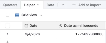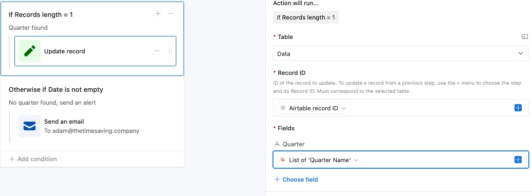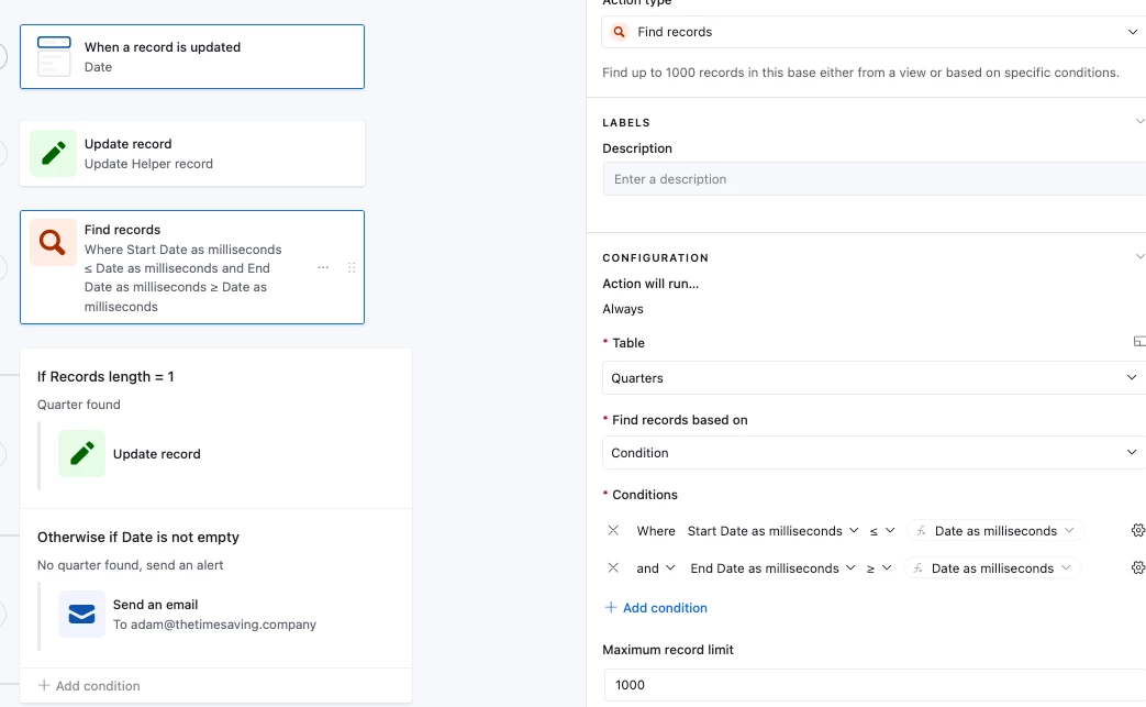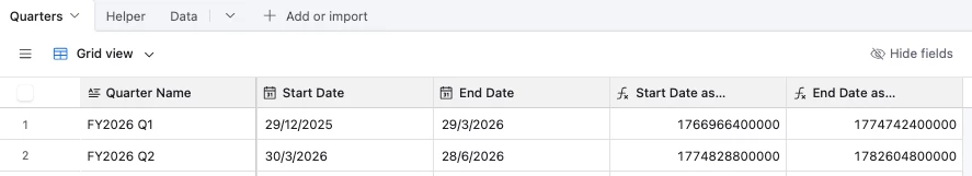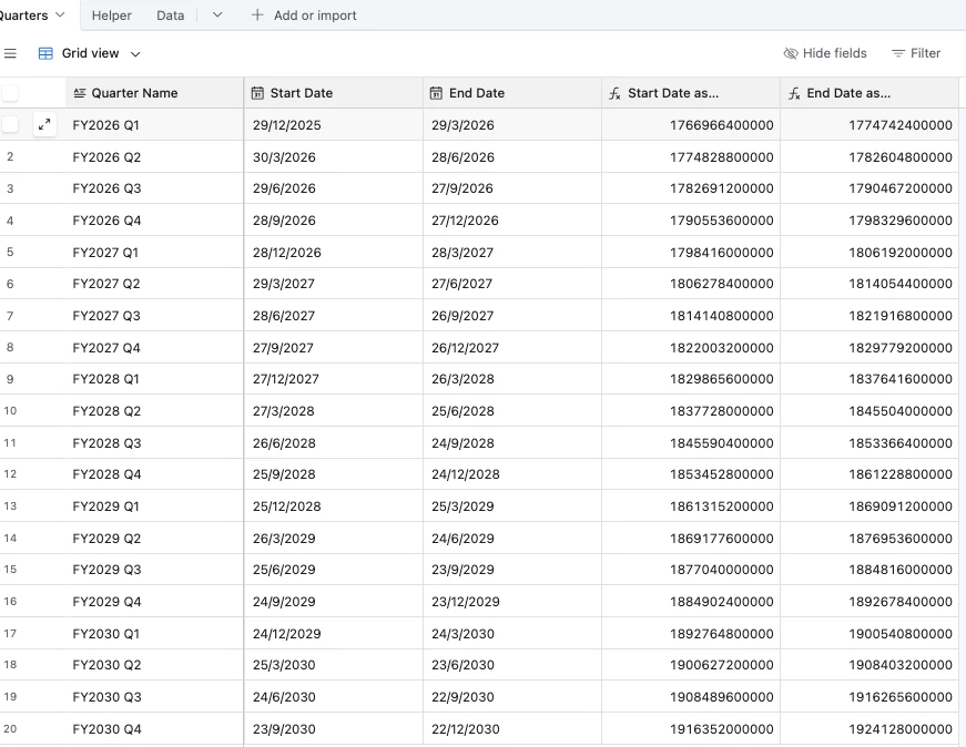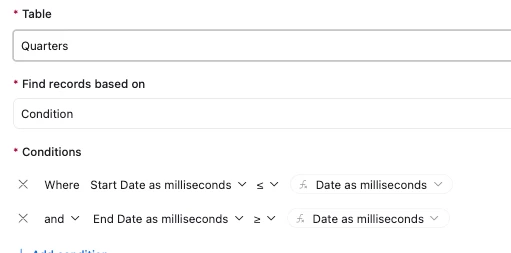 Hi, I am looking for help with dates and quarters - we have several date fields across multiple tables that currently use each a LONG formula to calculate fiscal quarters (with specific start and end dates, not just first/last day of the month). I am hoping to find a way to use a table with start/end dates to populate the quarter fields in these other tables. I don’t want to use linked records, I think that would be too difficult to manage given our volume of data. I don’t think I can do it with a formula because I need information from separate tables. Is there a way to do this with an automation? Something like...when X date field is updated, find value from Y table?