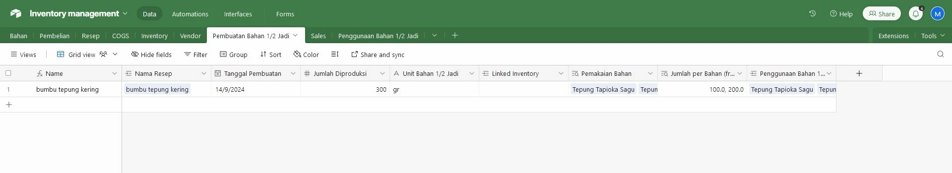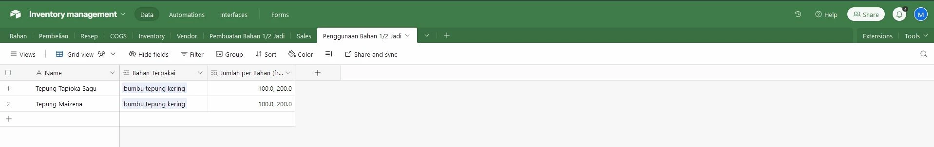 so, that is for recipes table and inventory table. now i am confused in the making the 2 new tables (sub-Ingredients table and sales table) with automation (to update invetory table) and Form Interfaces: