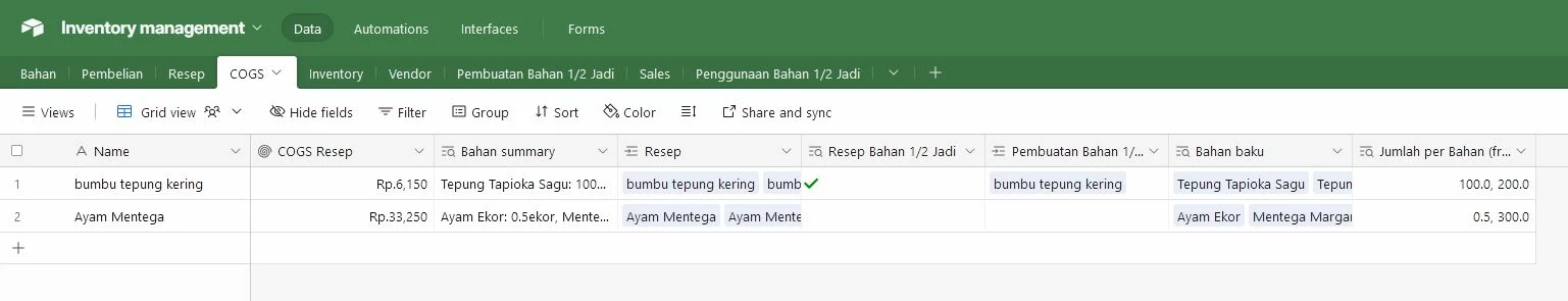 Then i have intermediary table name COGS, which in this case helping to roll up the ingredients for recipes with multiple rows of ingredients.