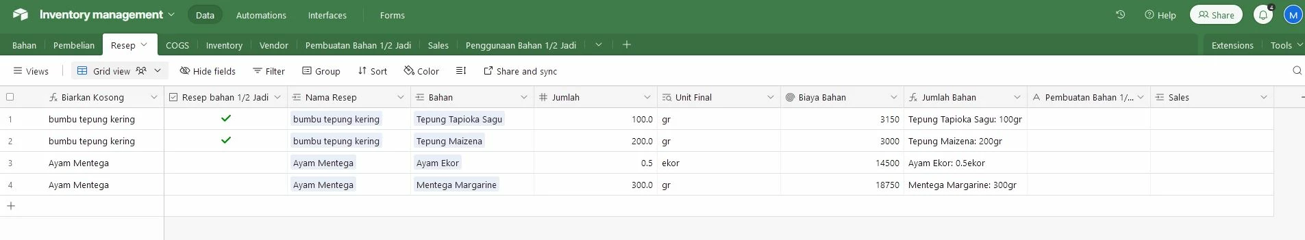 Recipe A (sub ingredients) need 3 kg of "Bahan" B + 5 kg of "Bahan" C, so will have 2 rows ("v" is ticked checkbox for "Resep Bahan 1/2 jadi"):