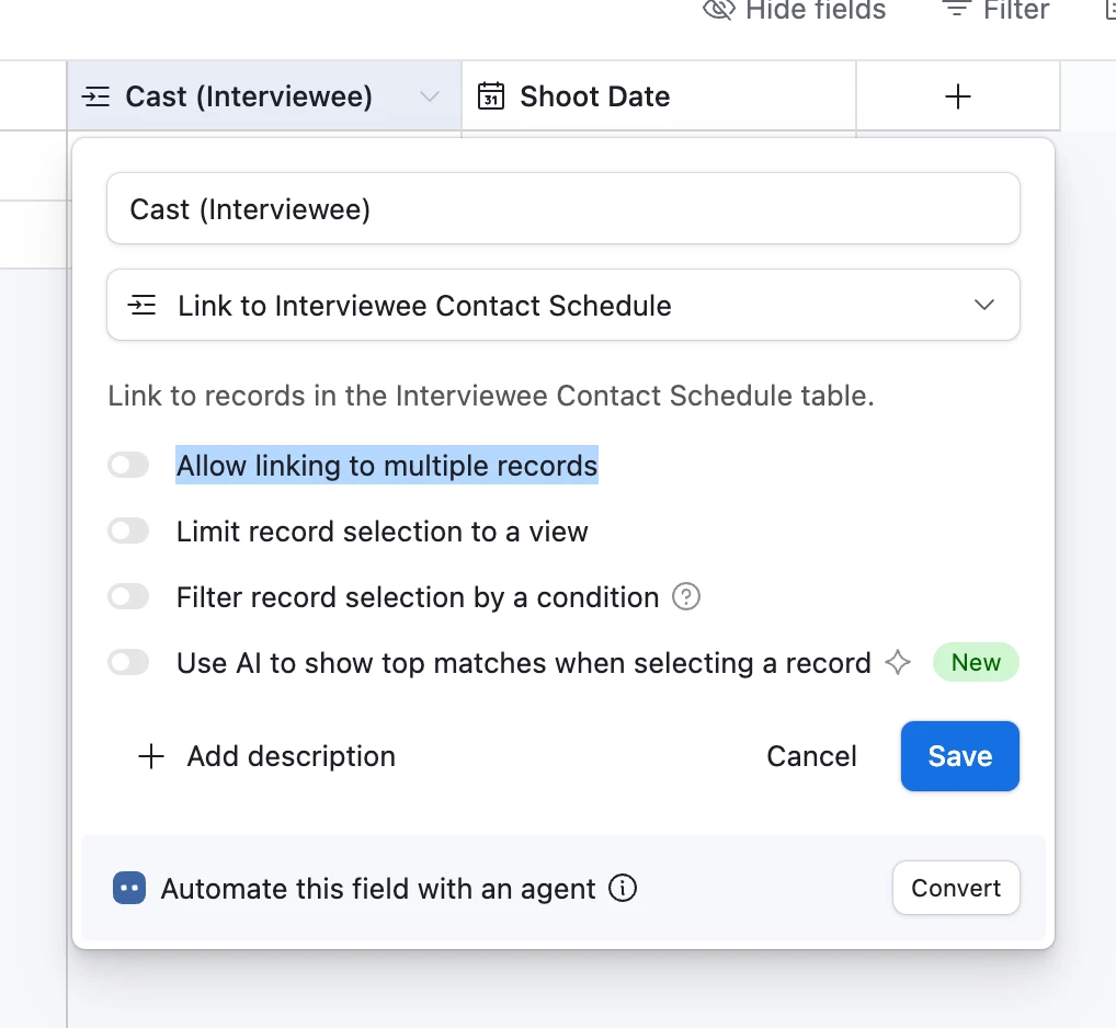 But now I’m wondering - is the issue with the linked field in “Shooting Schedule” itself? Should I link it to “Interviewees Contact Status” instead of the whole database of Interviewees?