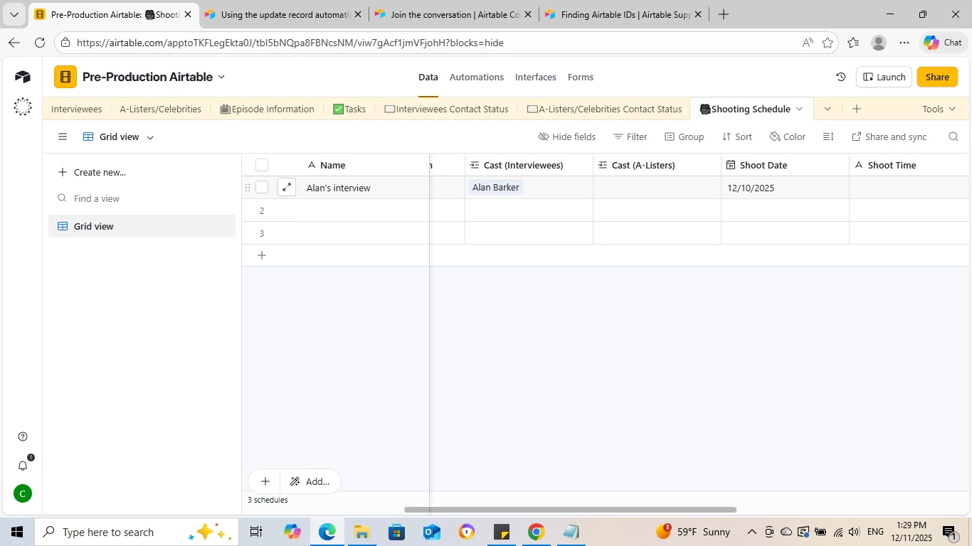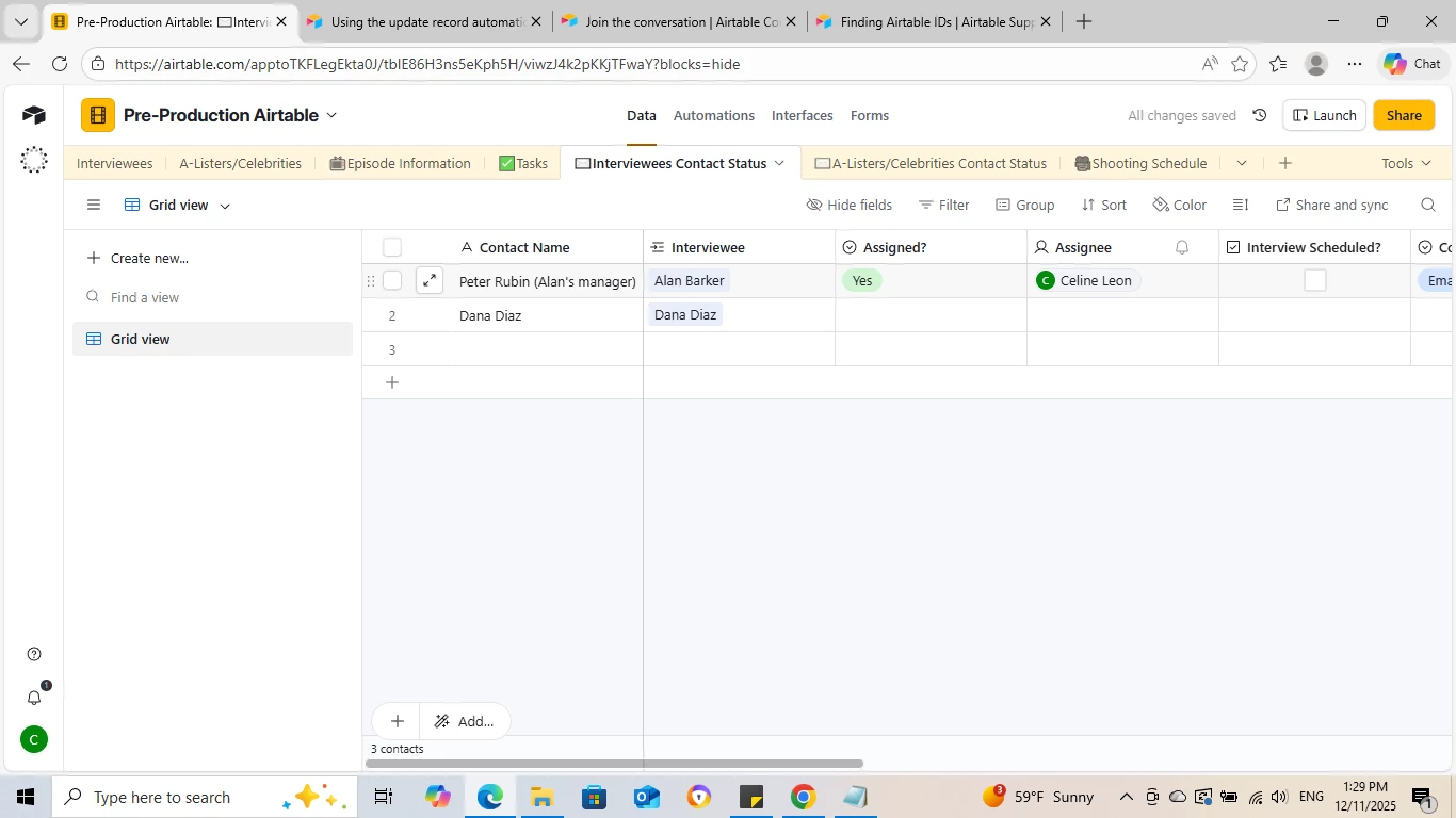 I’m now trying to set up my tables so when “Shoot Date” is updated in the “Shooting Schedule” table, the box is checked under “Interview Scheduled?” in “Interviewees’ Contact Status” for the corresponding interviewee, in this case, Alan Barker.