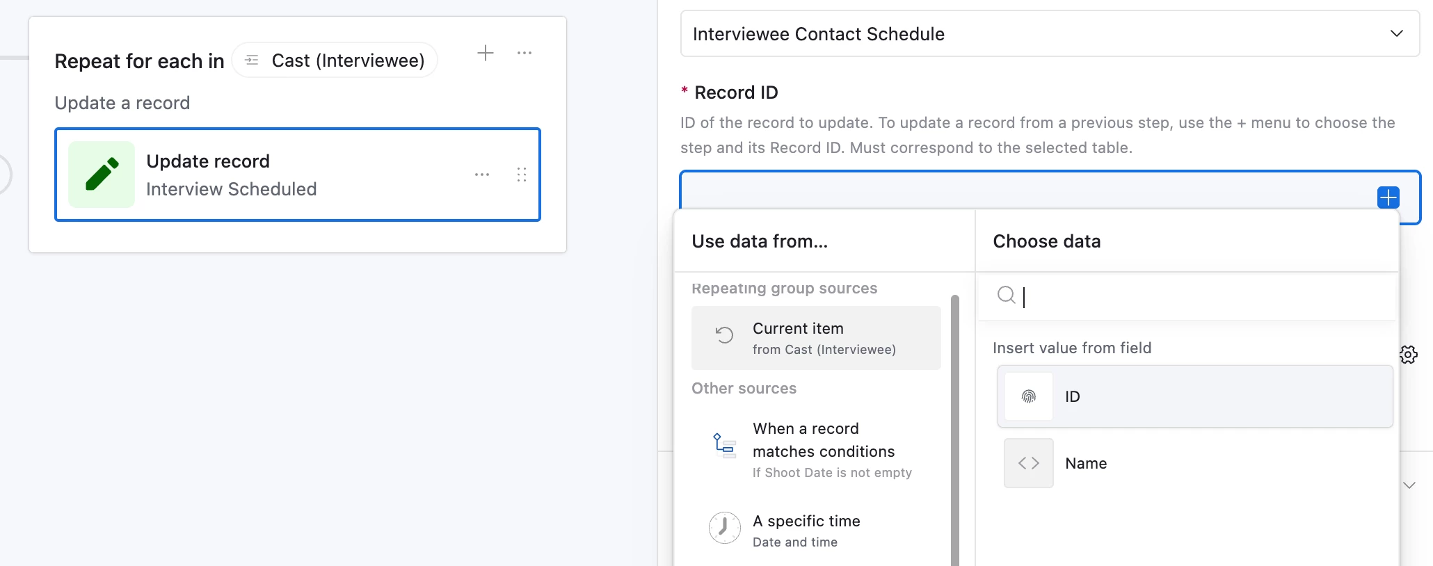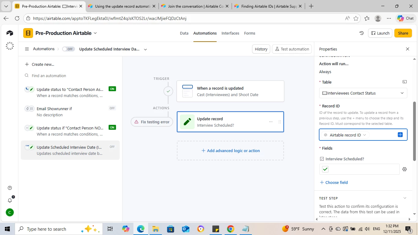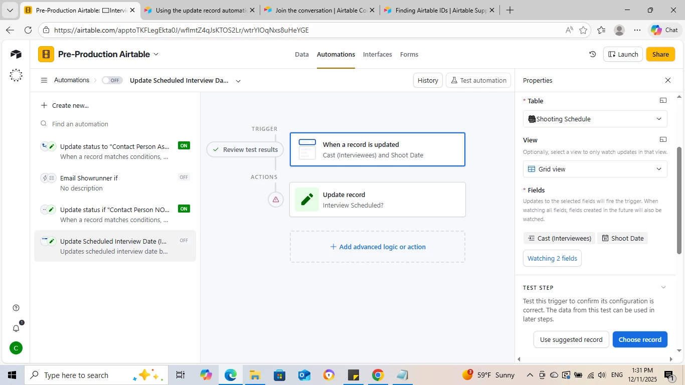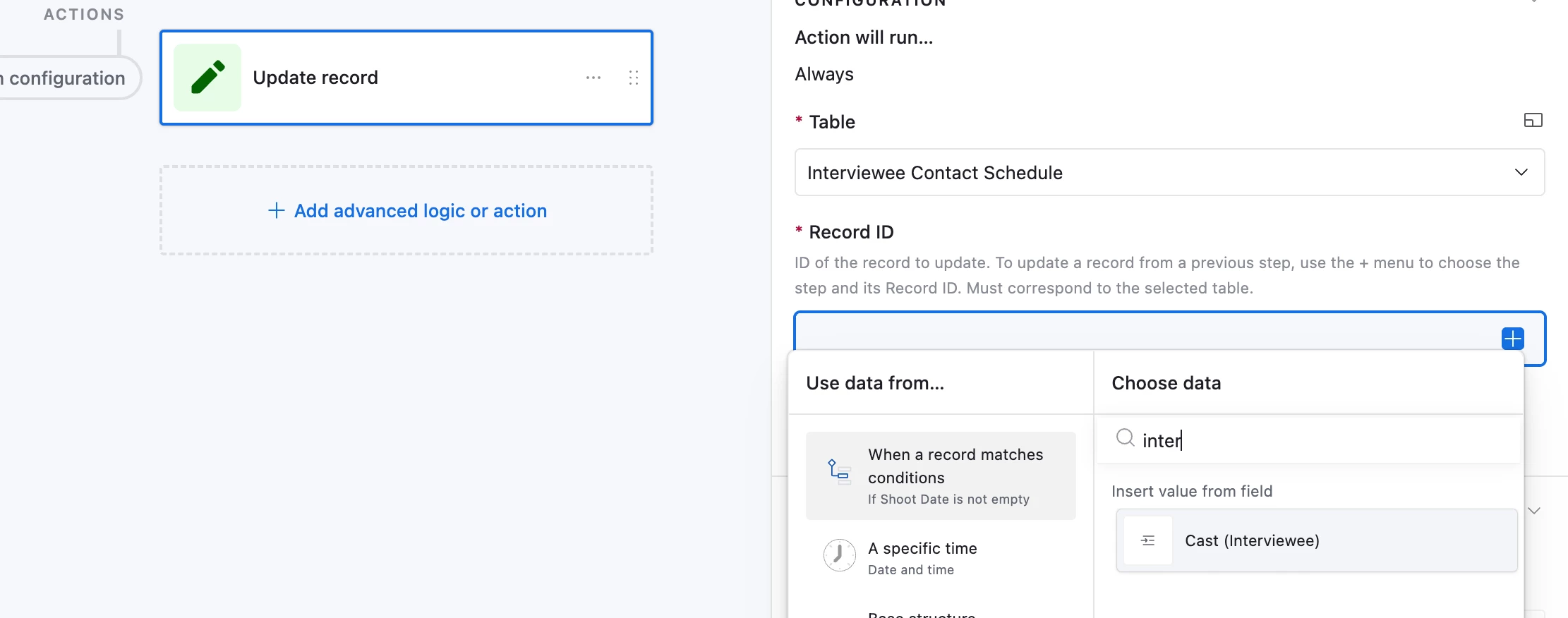 For the trigger step, I’m not entirely sure how many fields I’m supposed to select. I only selected “Shoot Date” initially and the automation didn’t work so I thought the issue might be I didn’t select “Cast” which is a linked record to the database of interviewees to help it find the corresponding person who’s “scheduled interview” field must be updated.
