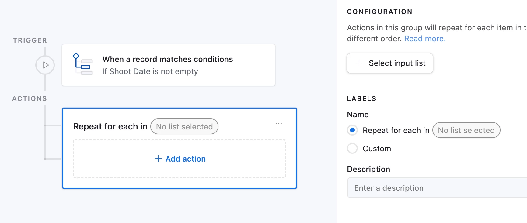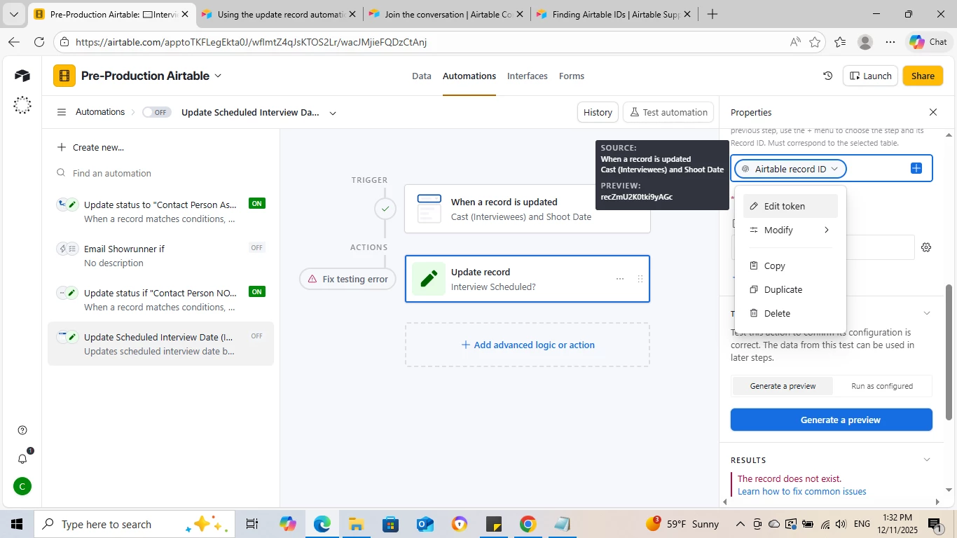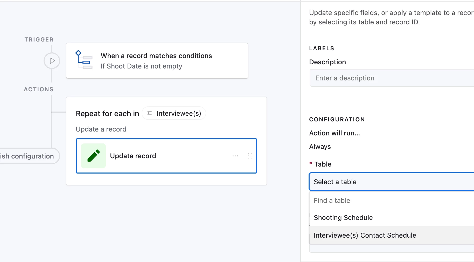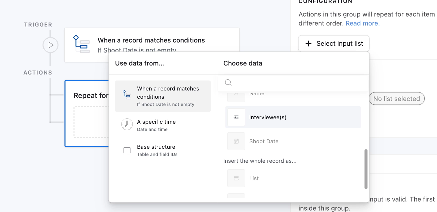 For the trigger step, I’m not entirely sure how many fields I’m supposed to select. I only selected “Shoot Date” initially and the automation didn’t work so I thought the issue might be I didn’t select “Cast” which is a linked record to the database of interviewees to help it find the corresponding person who’s “scheduled interview” field must be updated.