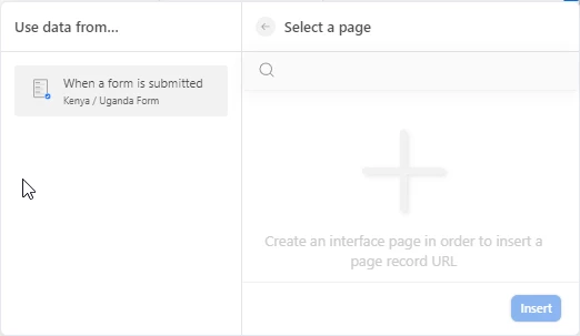 My problem could be solved one of two ways, if I could get the URL to work, or if I can get the Page Record URL to show my interfaces. They aren't listed, and doesn't help me solve this problem. Please see attached screenshot to see the blank Use Data From "Select a page" area. These interfaces are published and active.