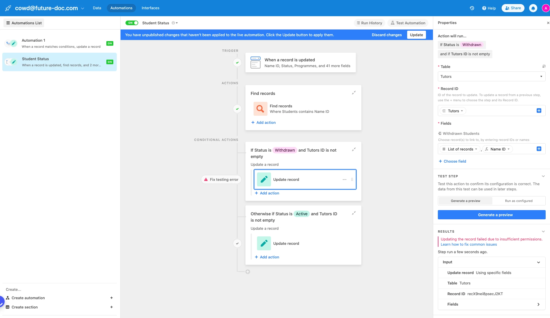 Within the Tutor table, we currently just have 1 field displaying all of the Students for that Tutor, but we would like to automatically filter these with Automations when the student status is changed to show in separate columns if they are active or withdrawn (in the student table) Please see the below screenshot of the current setup