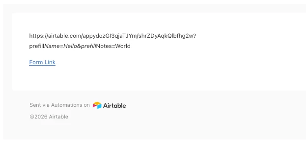 I’m keeping records of applicants in my Airtable base. I wanted the applicants to be able to review the information I entered into Airtable and make any changes to them if needed. I already created the form and a separate table to do so, and I created a link (in a formula field) to their own pre-filled form using the Airtable extension. I also already created the automation to update any changes made with their pre-filled form. All of that works great but only when you click or copy and paste directly from the link in the Airtable formula field.
