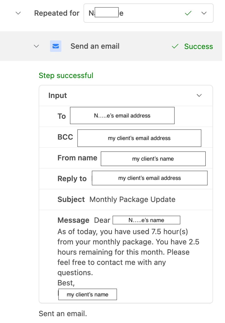 Action 2: Using the records that were found in Action 1, send one email per record. Each email has my client's email address as both the bcc: and the Reply To email.
