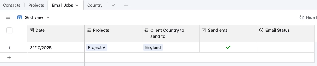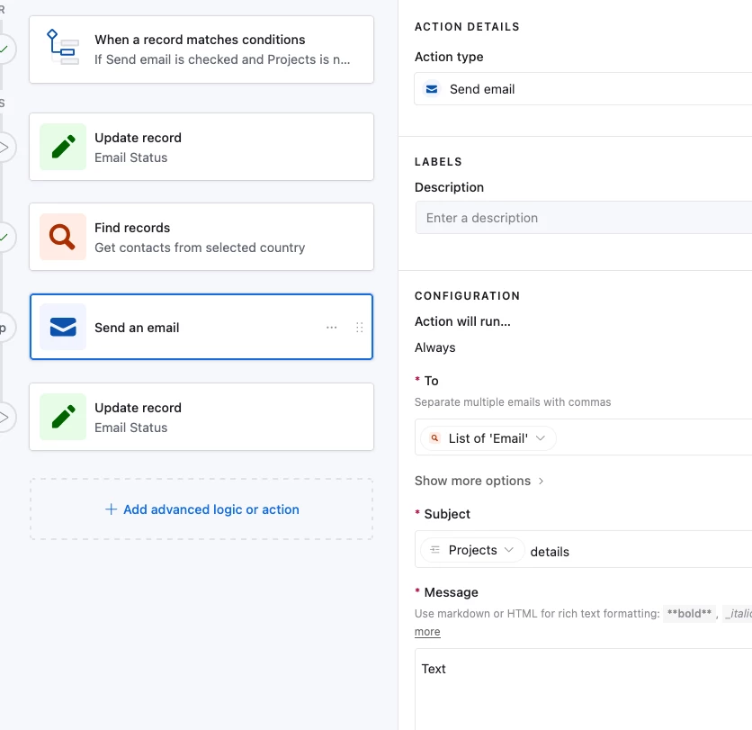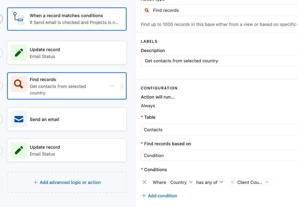 And your automation would look something like this where you’d have a ‘Find Record’ action to look for all the Contacts with that Country selected: