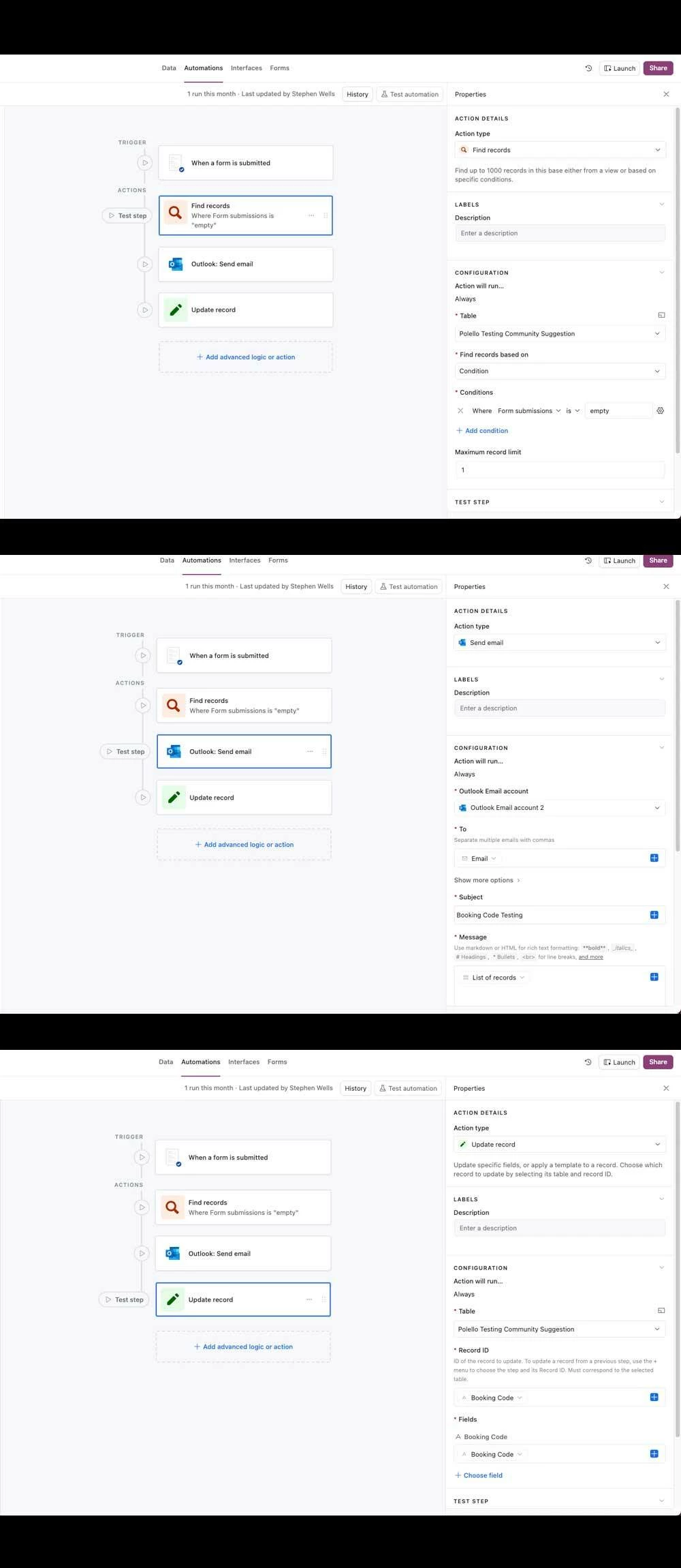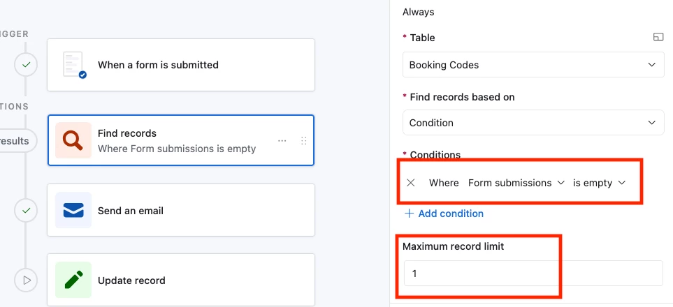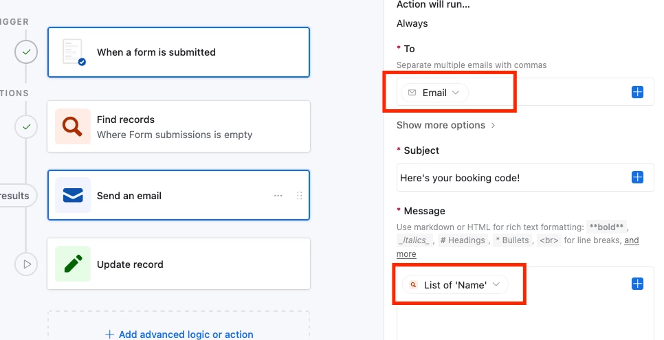 We're trying to send a email with a unique booking code from a list of booking codes sent to us when a form is submitted.