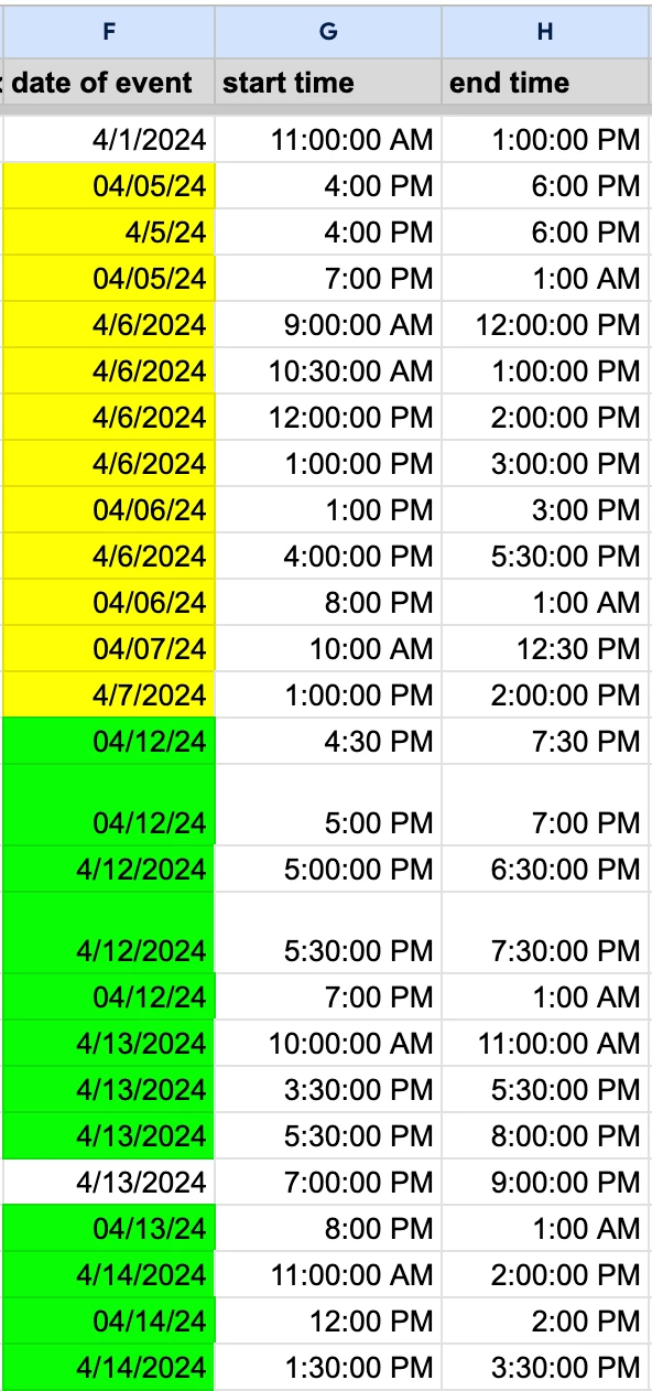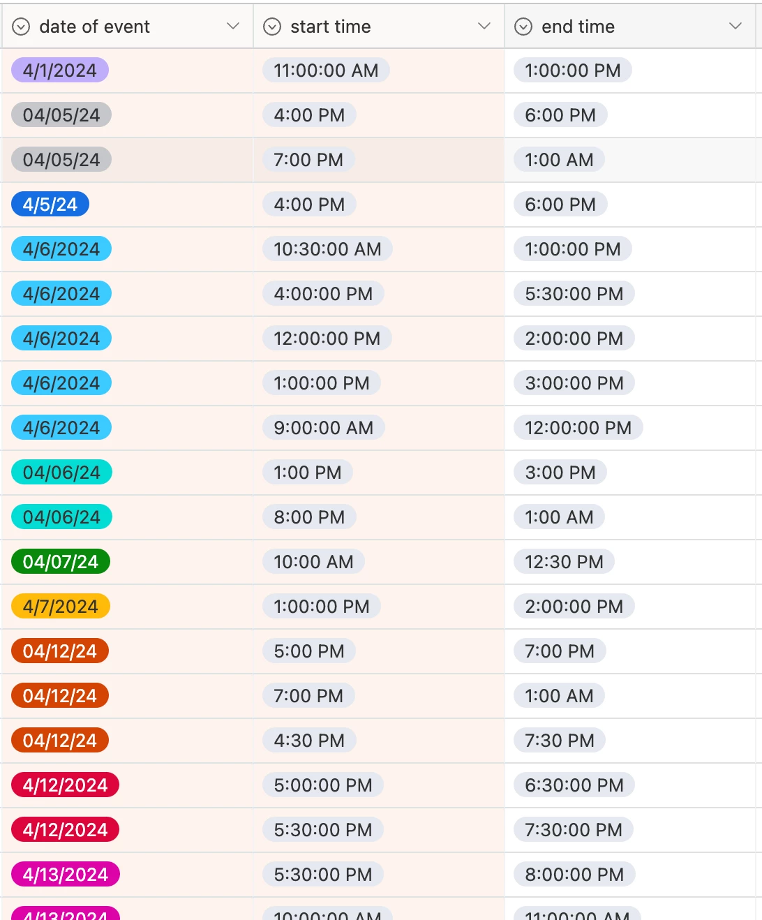 Hi! I have a large existing google sheets I am trying to organize into Airtable. I own an events agency that books out talent for hundreds of events each month. This is a living document that is updated every day by people who fill out our form to book - this was a google form that dropped down into a google doc, but Airtable seems much more user friendly. I want the rows to automatically drop into date & event start time order with an AM/PM format. My current information has the date, start time & end time in separate columns but the Airtable automation has date/time within one field. Is there a way to merge this so my existing data can format without me having to re-input hundreds of upcoming events into a new spreadsheet?