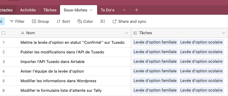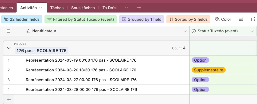 - In Activités, when an activity with the status Option or Supplémentaire gets the status Confirmé and therefore enters the view ''Représentations confirmées'', create a list of subtasks to complete in the table To Do's (which would be determined by the type of task that appears in the Tâches table).