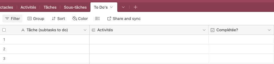 - Tâches contains our main tasks and Sous-tâches contains the subtasks. Both are linked.