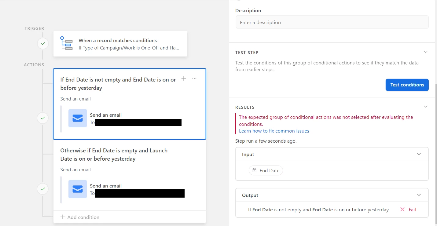 Both conditional actions are to send an email, however neither action is generating an email after running for over a week.