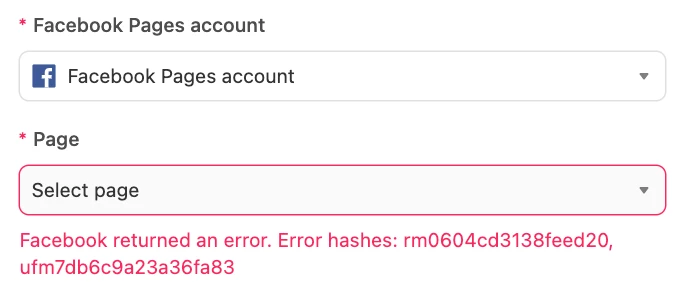 I'm an admin on 300+ Facebook Pages. When I try to select a page to tie an automation to, I receive this error message: "Facebook returned an error. Error hashes: rm0604cd3138feed20, ufm7db6c9a23a36fa83"