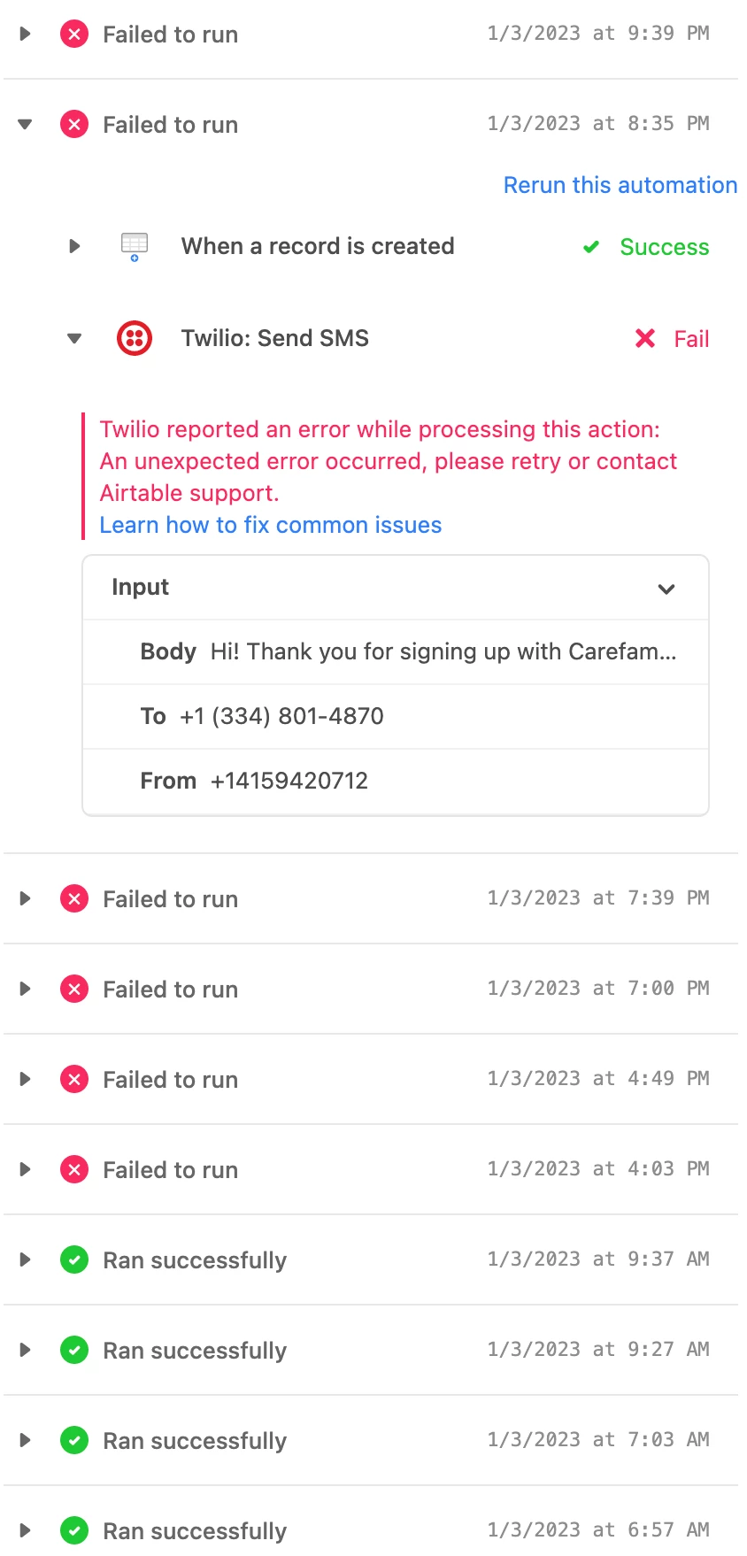 Today the automation started failing noting "Twilio reported an error while processing this action: An unexpected error occurred, please retry or contact Airtable support."