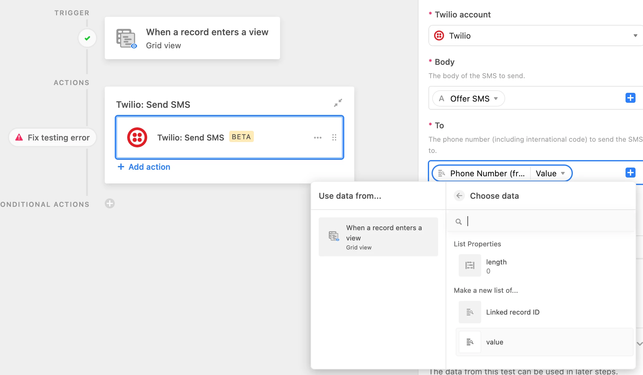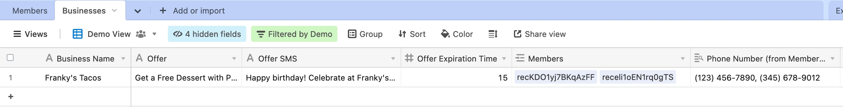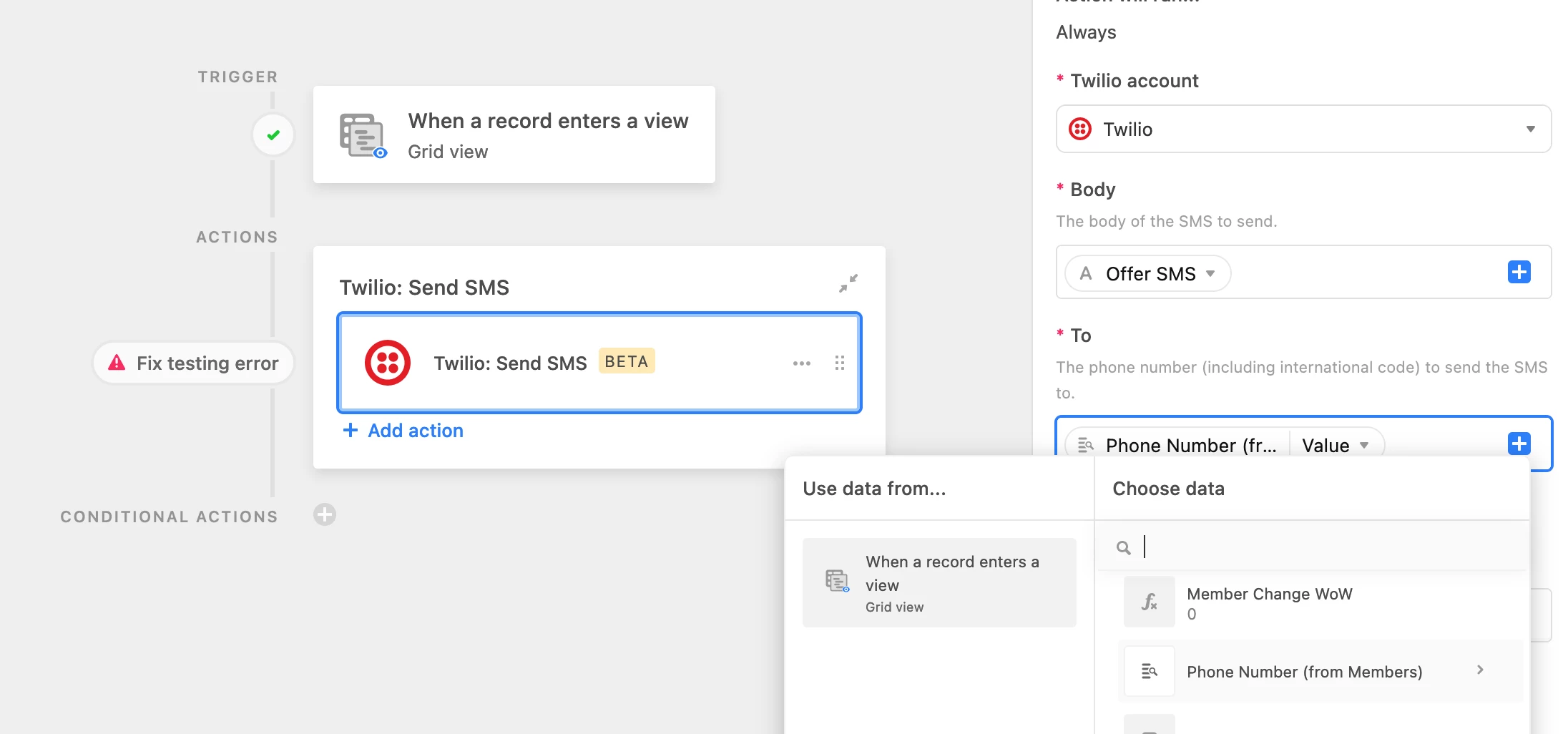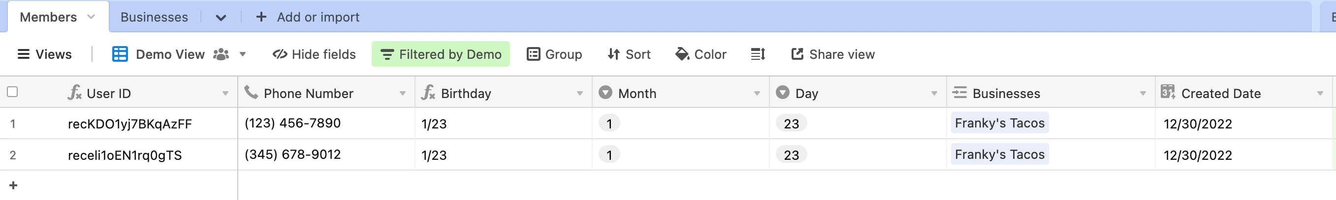 I have a business table and a member table. The business can have many members, and the member can have many businesses. However, I want to send a specific text message (via twilio beta) from each business to only their linked members. Is there a way to do this? Twilio throws an error (blank value) when I pick values from the linked member list. I almost think I need a third helper table with single member to single business links. For consideration, the member list would ideally be unique values. Additionally, I would be looking to build this out only to send a message on a member's birthday. Thank you!