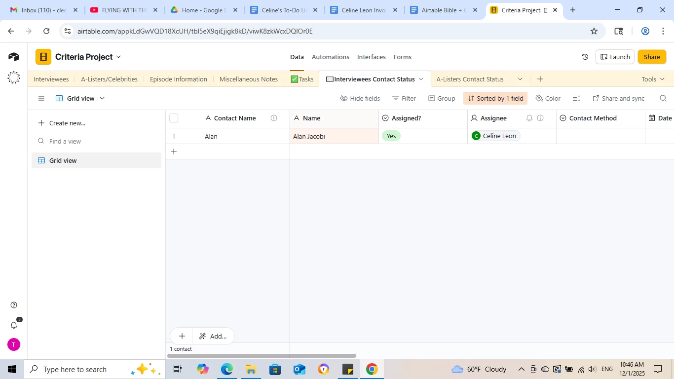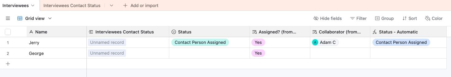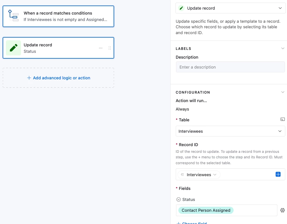 I’d like that when a record is assigned a contact person (The “Assigned?” field is “Yes”) and given an “Assignee” to carry out this task, that the status of that record be updated in the “Interviewees” table to “Contact Assigned.”