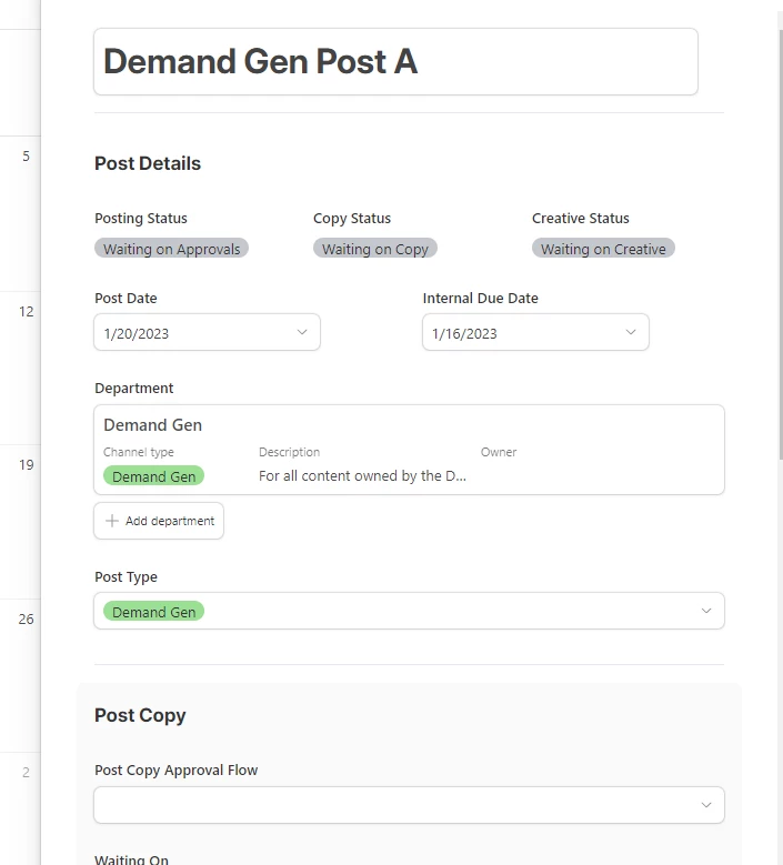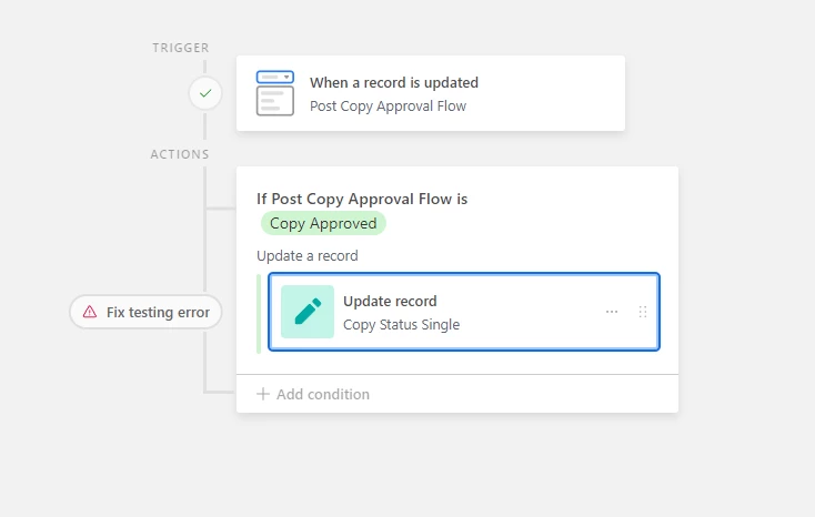 EXAMPLE: We're creating a content calendar for our social clients. If we have records for POST A, POST B, and POST C, I want it so if someone changes a single dropdown labeled "Copy Workflow" to "Copy Approved" that in POST A, that it updates the status of another single dropdown in POST A labeled "Copy Status" to "Approved" automatically.