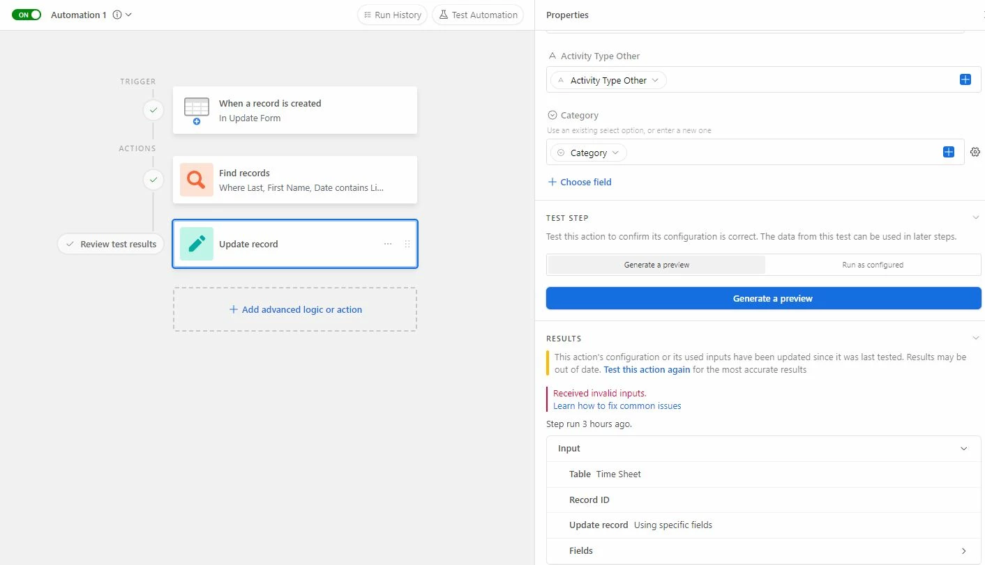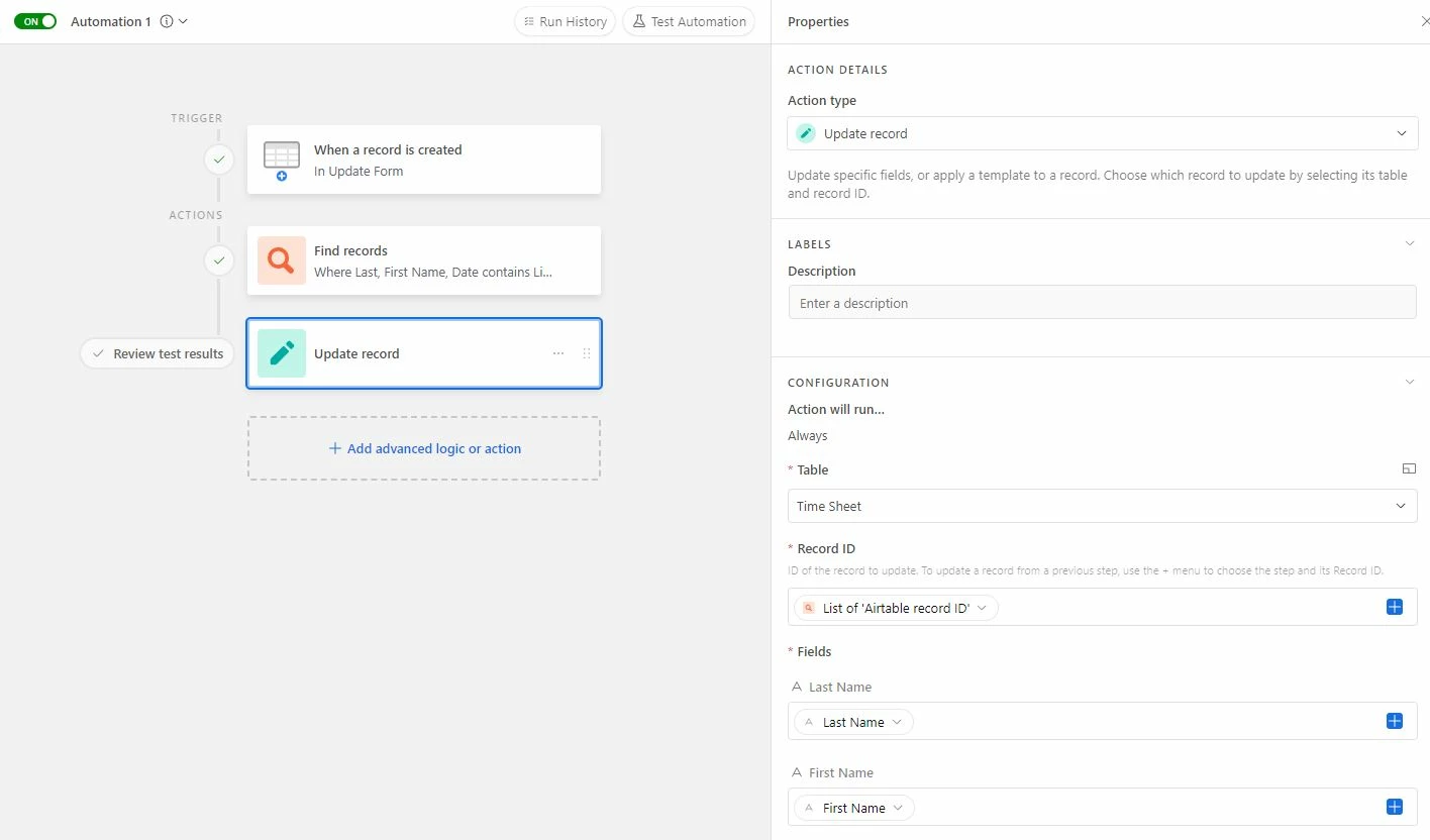 I use Airtable for timesheet purposes. The employee completes a form in Airtable, and then that causes a row to be created in my Timesheets table. Then the payroll staff go in and click an "Update Row" button on the row to enter the date paid. My primary field was a concatenated field of Last Name, First Name, Date Worked when I realized that a person can have 2 rows for the same date which apparently broke my automation. I have been researching this all day and I do not know how to fix it. Someone pretty please help! Screenshots included. Thank you!