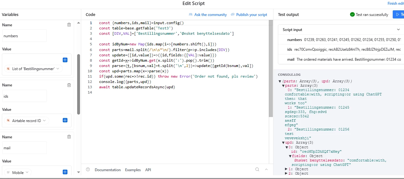 Hi, Parsing require precision in details, so you can test and see if script works. I just made a small test with a different approach - I did Find records for Ordered status and then used results to avoid querying in script. You can use it in case of any problems with ChatGPT version