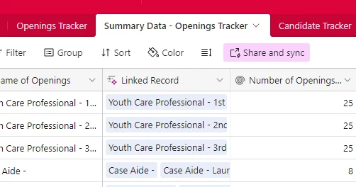 If the record is created in Openings Tracker, I want it to automatically add to the total number of openings for that Opening Type in the Summary Tracker (table B).