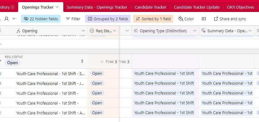 If a record created in Openings Tracker (table A) is created, then I want to add that record to the linked record field in Summary Tracker based on the fields Opening Distinction and Req Status. The linked record field is pulling the openings record from Table A based on manual addition right now.