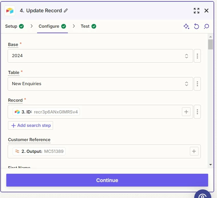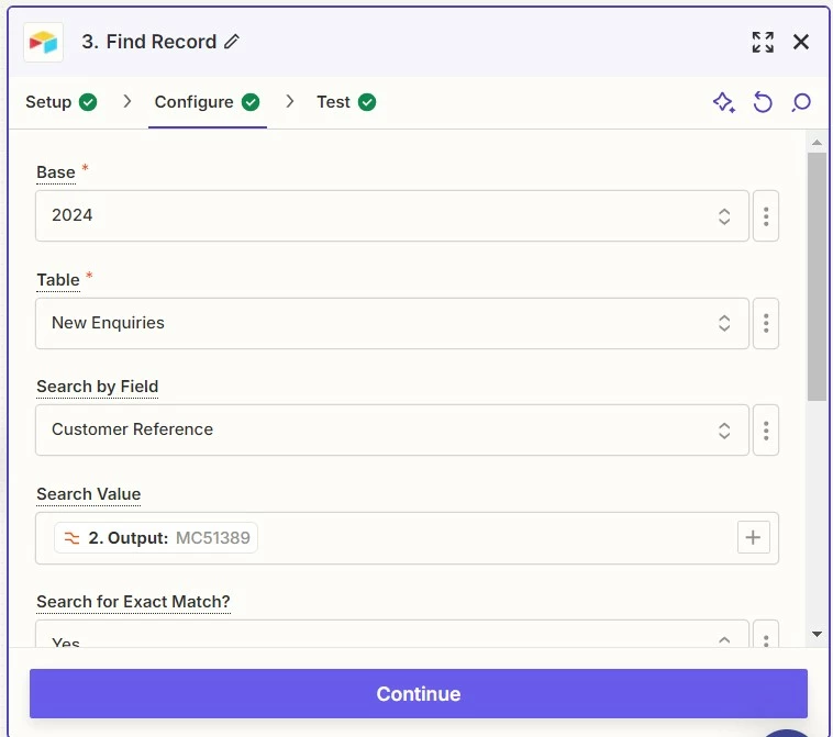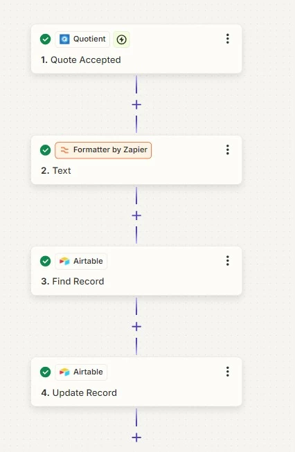 The record is found based on the same unique text in Quotient which marries up to the unique customer reference in Airtable.