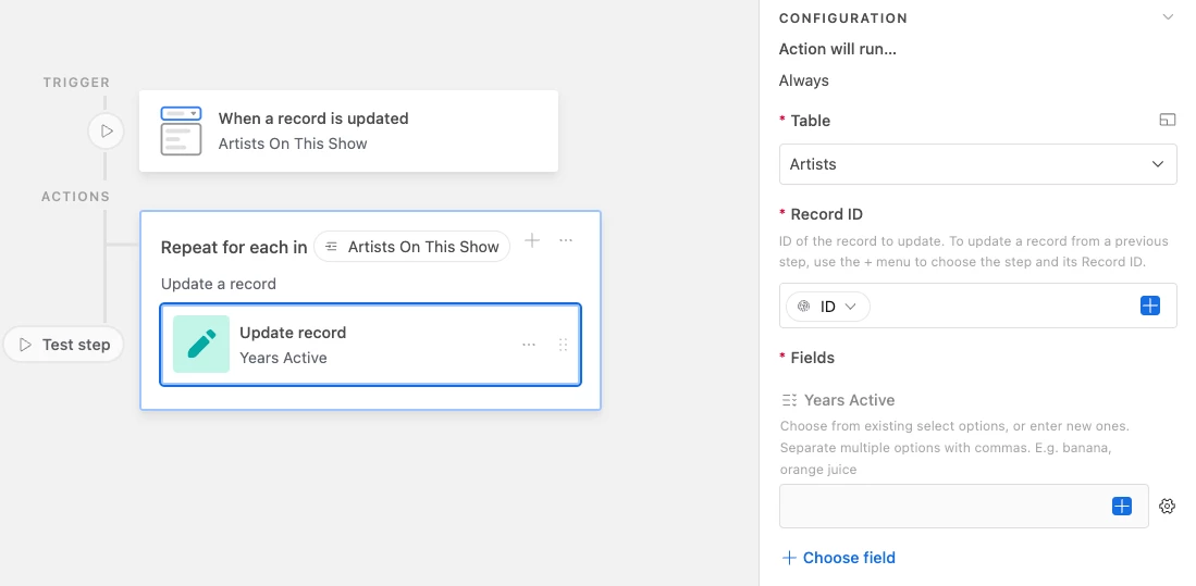 Some Artists perform on shows year after year. I have a multiple select field in the Artists table for "Years Active."