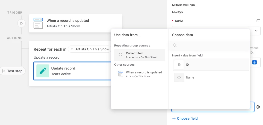 Normally, I would insert the current value of "Years Active" followed by a comma and then "2024." However, the only two fields I can insert are the record ID and name field. This seems to be a limitation of working within a Repeating Group. I'm hoping someone smarter than I can figure out a different way to approach this issue, or point out what I'm doing wrong. Thanks for reading!