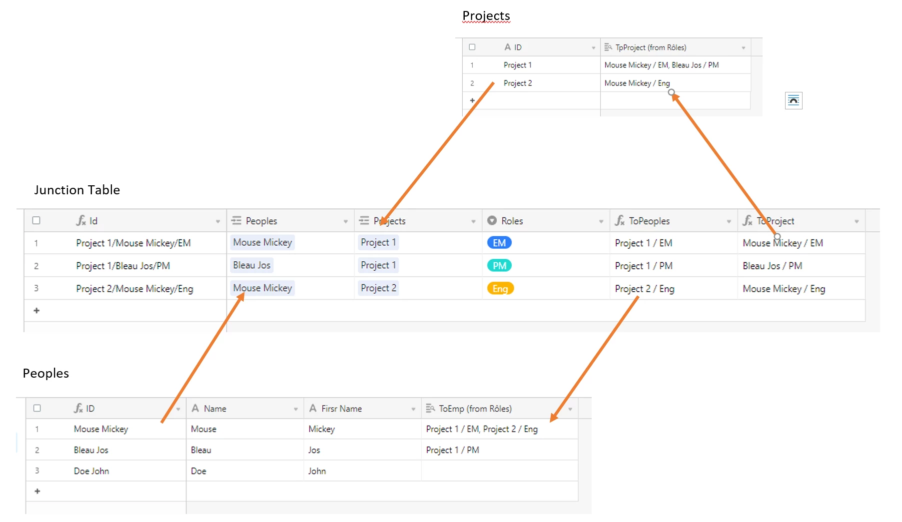 On Each project there are assigned multiple roles from people which are each linked columns, i.e.